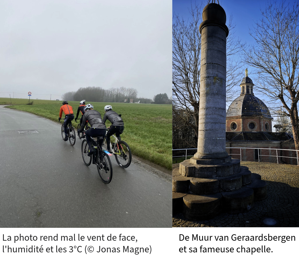 Paradoxalement, c’est plutôt agréable de rouler dans ces conditions. La météo est régulière (NDLR couverte et humide) et la température ressentie constante (NDLR froide). Habillé d’une tenue adéquate, ça en deviendrait presque plaisant. Qui plus est lorsque l’on est en compagnie de copains et sur des routes aussi célèbres. Le Kappelmuur n’est finalement pas si terrible et l’on comprend aisément comment Fabian Cancellara a lâché si facilement Tom Boonen dans sa seconde partie (@alain merci de masquer ce passage pour tous les internautes avec une IP belge).
