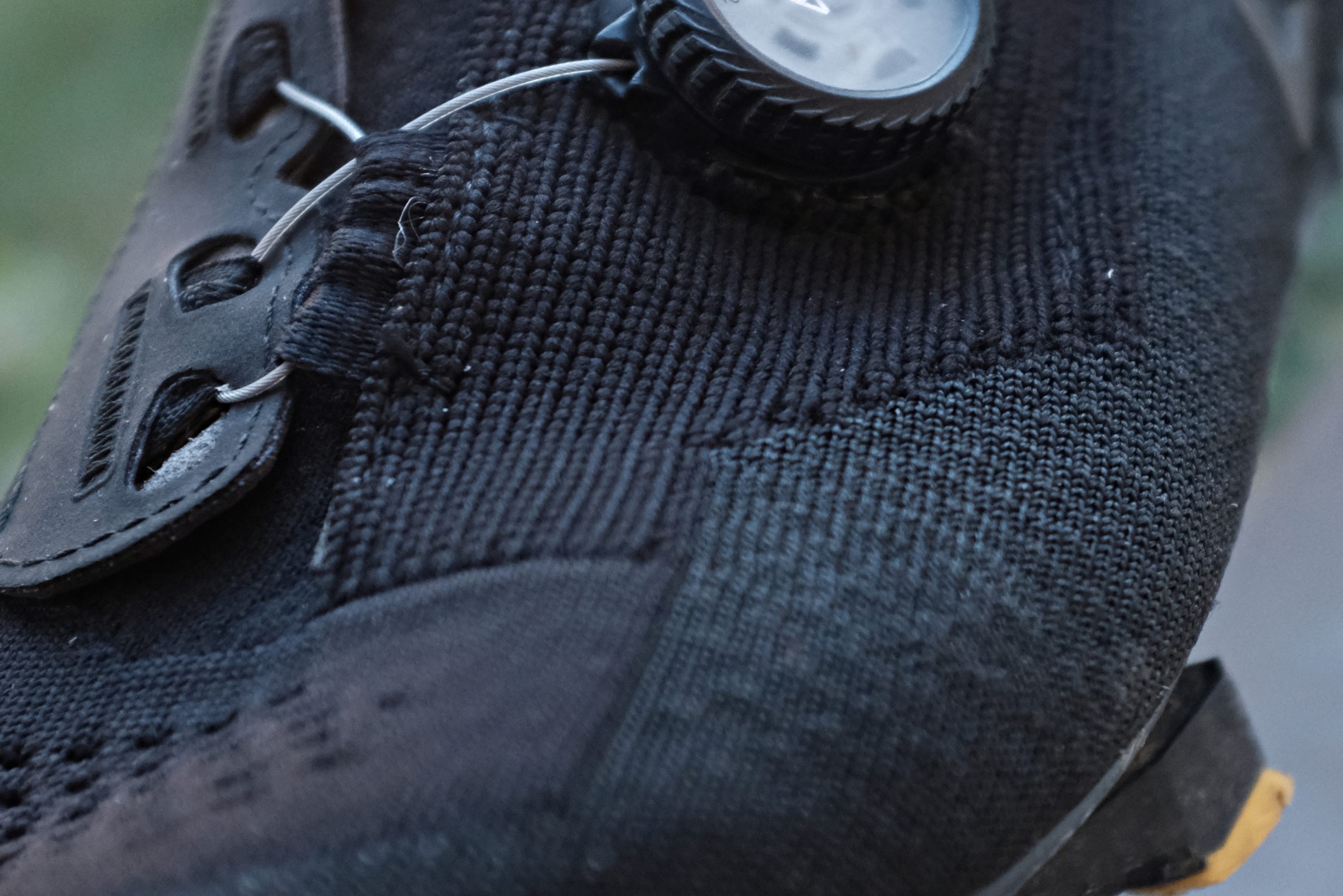 D’allure discrète, ces chaussures Dottore Clima sont tout sauf minimalistes. L’empeigne et la languette sont fabriquées d’une seule pièce dans un mélange synthétique tricoté. La souplesse et la rigidité sont adaptées selon les zones grâce à une densité variable. Q36.5° utilise un mélange composé de 55% de polyester, de 30% de polyamide et de 15% d’élasthanne. Les pièces rapportées, où sont fixés le système de serrage (deux Boas), sont renforcées par un thermoplastique. Ce dernier change de couleur selon la luminosité. Au niveau du talon, la construction est rigide, à l’intérieur, un insert évite tout soulèvement du pied. La partie supérieure de la chaussure est fixée sur une semelle en carbone qui remonte en latéral.