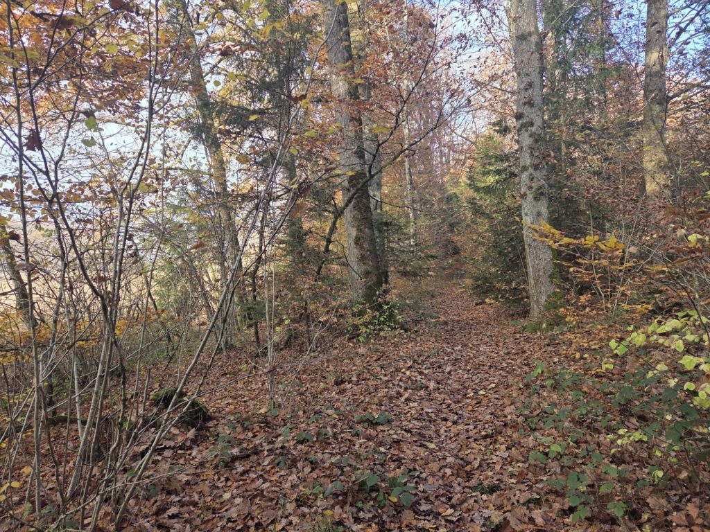 Attention km 35.3 pour être précis, le chemin indique le Stand de tir de Vernand en contrebas. Il est préférable de continuer la balade par la route qui rejoindra la suite du parcours.
