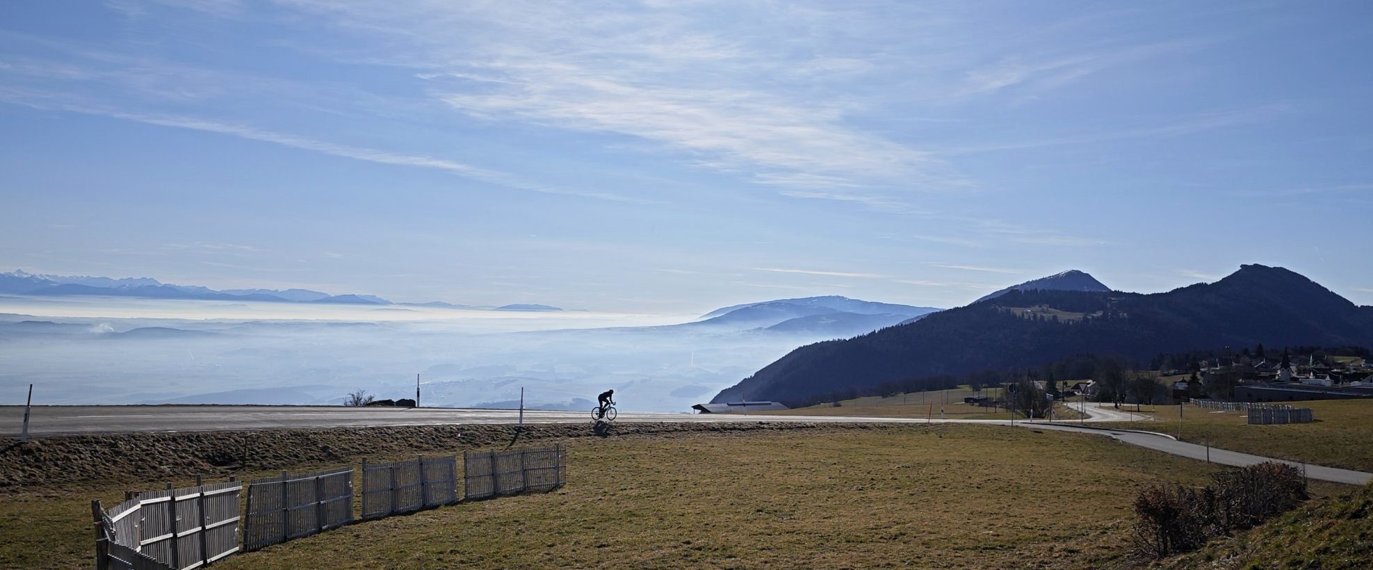 Un peu avant la mi-pente, tu retomberas sur une route connue et un court replat jusqu’à Villars-Burquin. La suite de la montée se fait une sur une route plus large, mais que marginalement plus fréquentée par la circulation automobile. À travers les arbres en bourgeons, tu verras à nouveau le Lac de Neuchâtel danser avec les feuilles naissantes. Ça grimpe encore et toujours jusqu’à atteindre le point culminant de ta journée : Mauborget. Connu pour son domaine de ski de fond et pour son spot de parapente.