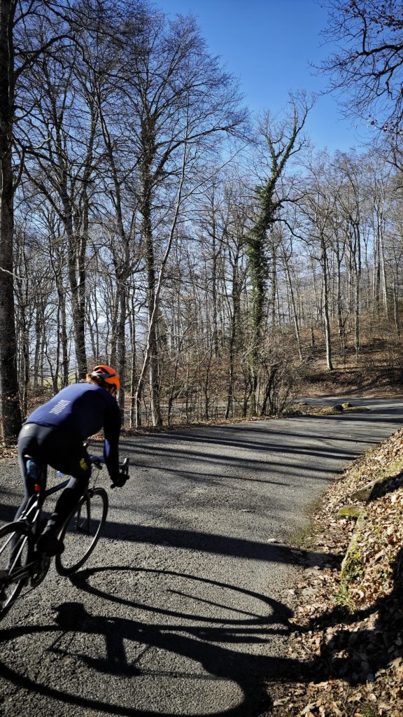 Après une descente sur une belle et large route au revêtement parfait, tu vas faire un nouveau détour par Champagne pour attaquer la deuxième montée. Une forêt charmante t’offrant un bal différent au fil des saisons. De la fraîcheur en été, des éclats de couleurs en automne et un esprit de renouveau en cette reprise de saison. Le grain épais du revêtement n’est pas flatteur pour les watts que tu transmets au bitume. Voilà une bonne excuse si tu te sens collé (ce n’est bien évidemment ni le foie gras de Noël ni le Gâteau des Rois qui auraient pu en être la cause).