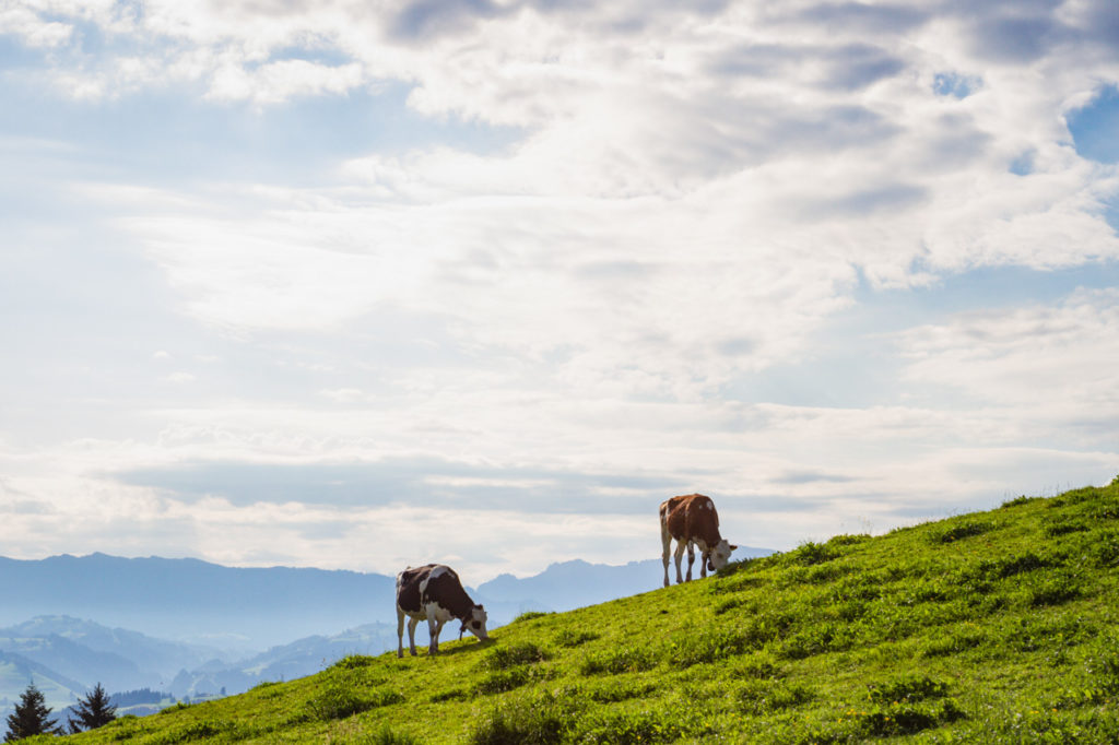 Au cours de la montée, on peut admirer les fermes typiques de l’Emmental: de grandes bâtisses en bois ornées de fleurs, avec un toit imposant tombant très bas de part et d’autre.
