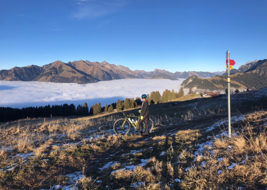 Le lendemain matin, nous avons traversé la vallée du Simmental en suivant cette fois-ci la route suisse n° 9 à travers un mélange de gravel et de petites routes. Etant sous les nuages, les conditions étaient assez froides, mais le paysage blanc et gris avait un calme et une tranquillité étranges. Il nous a fallu beaucoup de temps pour trouver enfin le soleil ce jour-là, au moment où nous avons pris la route de VTT n°1 à partir des Moulins pour monter sur un chemin de gravier au-dessus du Col de Mosses en direction des Monts Chevreuils et du Col de Sonlomont. Lorsque nous avons enfin trouvé le soleil, c’était presque l’euphorie. Notre plan était de continuer jusqu’au Lac de l’Hongrin d’où nous rejoindrions le col de Jaman, notre dernier col de gravel qui nous ramènerait au lac Léman.