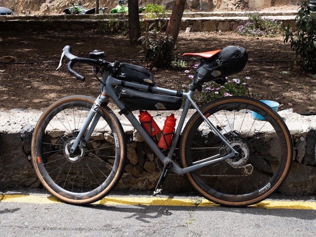 - Apidura Racing Frame Bag 4L (manchettes, genouillères, veste goretex, batterie externe, câbles de recharge)
