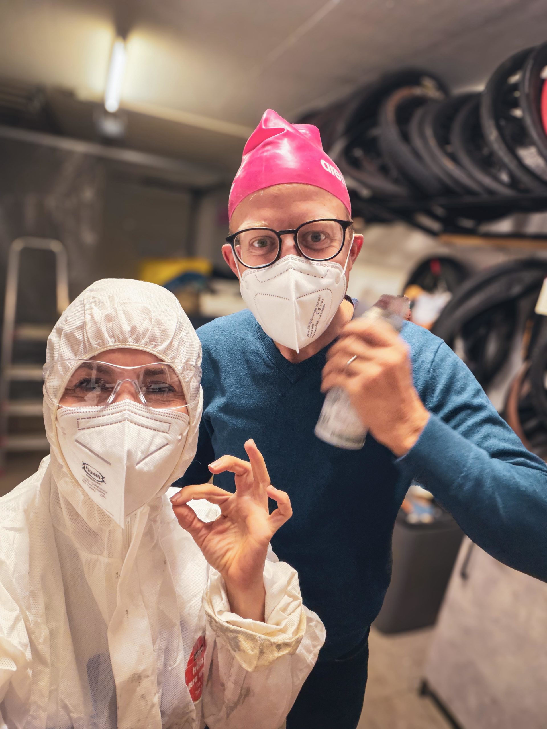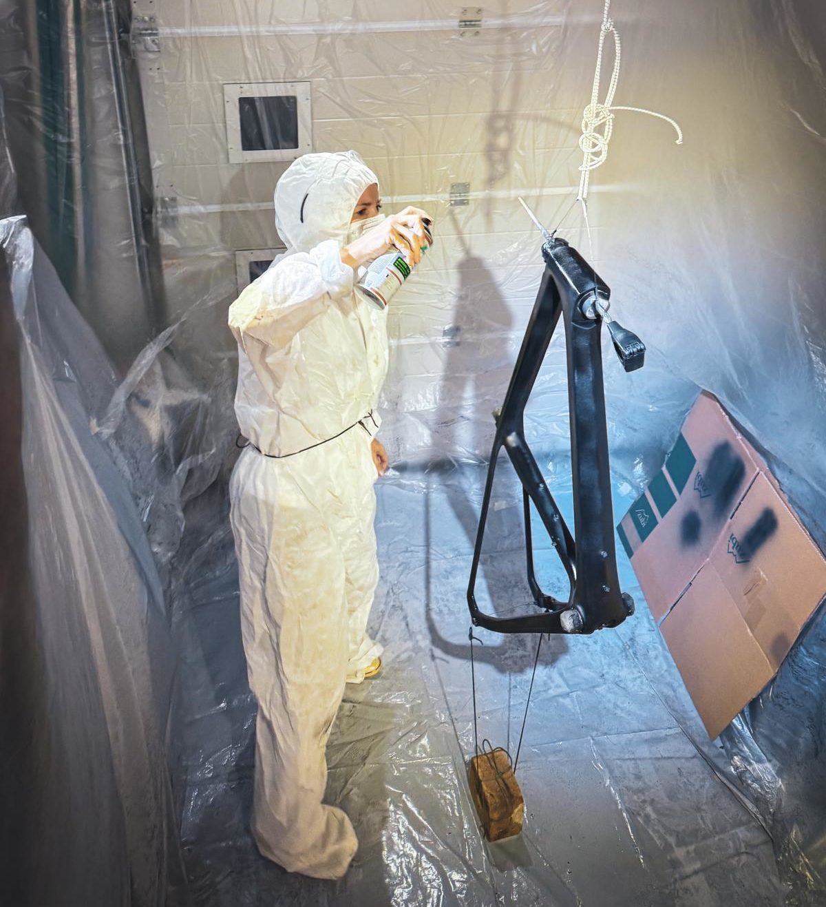Pour la peinture, on a choisi le spray. Faute de pistolet, mais aussi par simplicité. Il faut un endroit propre, le moins de poussière possible, et surtout tout protéger. La peinture est très volatile. Sol, murs, plafond : tout y passe. Combinaison, gants, masque, et une bonne lumière sont essentiels ensuite !